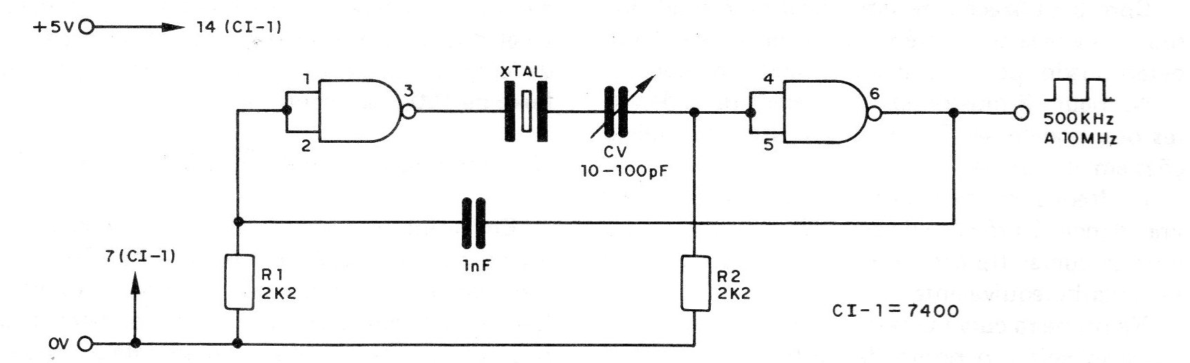 El oscilador mostrado en la figura utiliza dos puertas NAND de las cuatro existentes en un integrado TTL 7400. El cristal utilizado opera en la frecuencia fundamental y puede tener valores entre 500 kHz y 10 MHz. El trimmer CV permite ajustar el punto ideal de oscilación con mayor rendimiento para el rendimiento circuito. La alimentación debe realizarse con una tensión de 5 V y la señal obtenida en la salida es rectangular. Este circuito puede ser utilizado como base de tiempo de instrumentos digitales, tales como frecuencímetros, contadores, cronómetros, etc.
