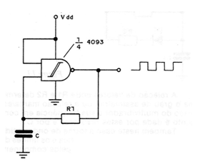 En el circuito de la figura tenemos una aplicación diferente del 4093. El multivibrador asolado en cuestión tiene una frecuencia que es dada por la constante de tiempo RC. El límite superior de frecuencia sólo se da por las características del CMOS integrado. en torno a 5 MHz. La frecuencia mínima se da sólo por la existencia de eventuales fugas en el condensador usado que, ciertamente, debe ser electrolítico. La señal de salida de este circuito es rectangular.