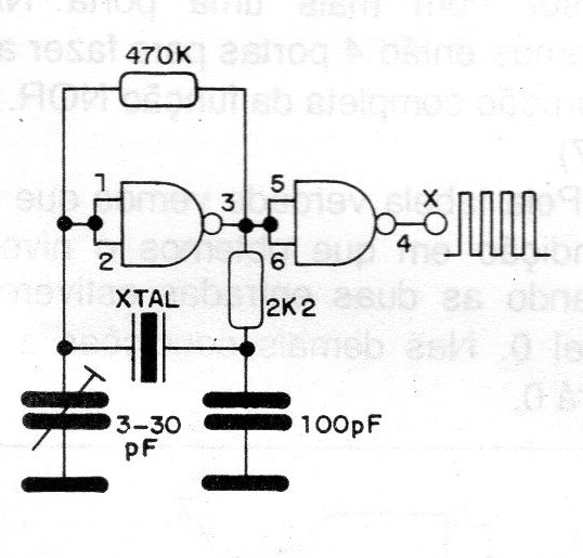 Un oscilador controlado por cristal de cuarzo, capaz de operar hasta 1 MHz aproximadamente, puede ser logrado con dos de las 4 puertas NAND del 4011, como muestra la figura. El trimmer permite ajustar el punto de oscilación y hasta desviar ligeramente la frecuencia de la señal.
