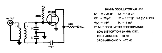 Este oscilador estable de 20 MHz fue encontrado en el Linear Applications Handbook de National Semiconductor de 1994. El FET puede ser de tipo común como el BF245. Detalles de los componentes, principalmente la bobina de datos al lado.