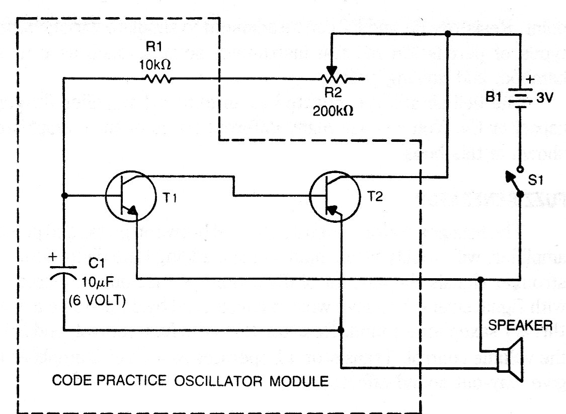 Este circuito, encontrado en una publicación americana de los años 1970, produce un tono audible en un altavoz. Se trata de una configuración tradicional que se puede montar con transistores BC548 y BC558 y alimentada con tensiones de 6 a 9 V. El potenciómetro de ajuste puede ser de 220k o incluso 470k. Un resistor de 1k en serie con C1 ayuda a mejorar el rendimiento del circuito. El altavoz puede ser de 4 o 8 ohms y para mayor potencia alimente el circuito con 12 V intercambiando T2 por un BD136. Reduzca C1 si el sonido es muy grave.