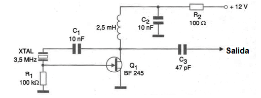 En la figura mostramos otra configuración para un oscilador de sobretom controlado por cristal usando un transistor de efecto de campo de junción. La frecuencia de este oscilador, que depende del cristal, puede ser entre 100 kHz y 10 MHz típicamente. Los capacitores deben ser cerámicos y el transistor de efecto de campo admite equivalente como el MPF102.