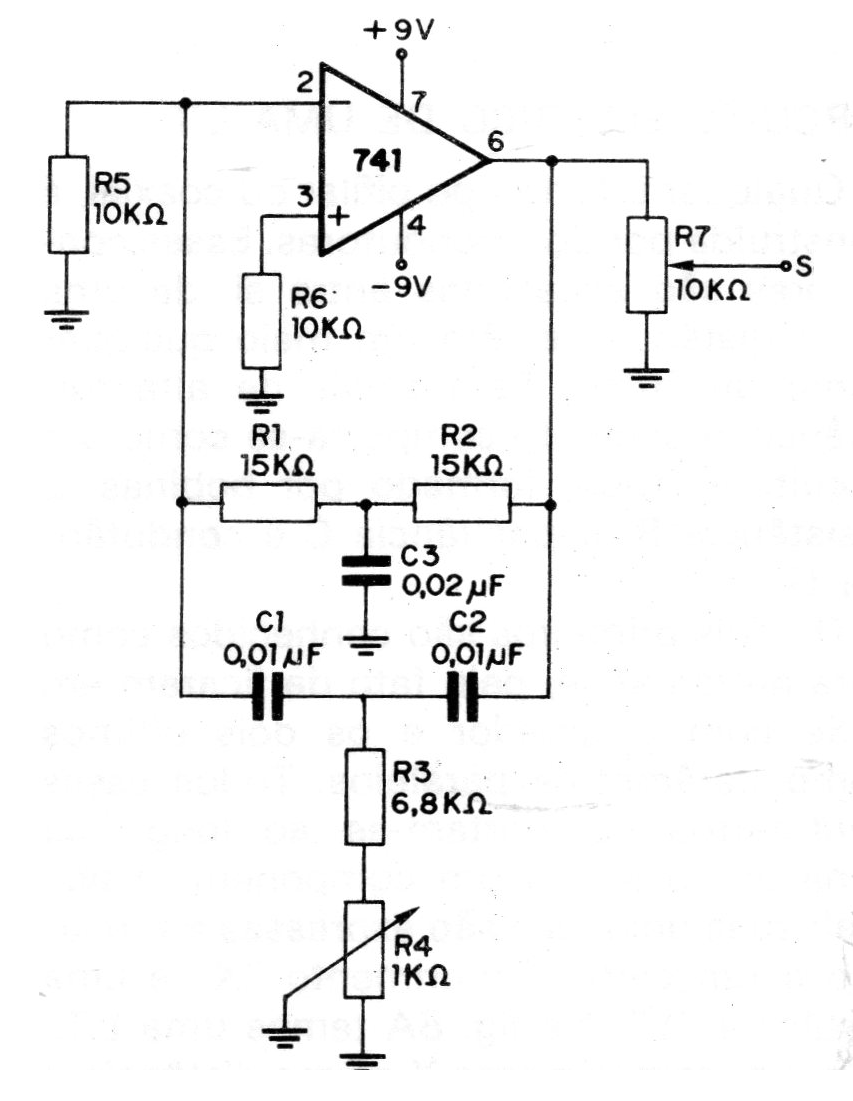 Esta es una de las muchas versiones de oscilador de doble T que el lector puede encontrar en este sitio utilizando amplificadores operacionales. El circuito proporciona señales senoidales y tiene un control de intensidad en su salida. R4 controla el punto de oscilación. La fuente debe ser simétrica de 6 a 12 V.