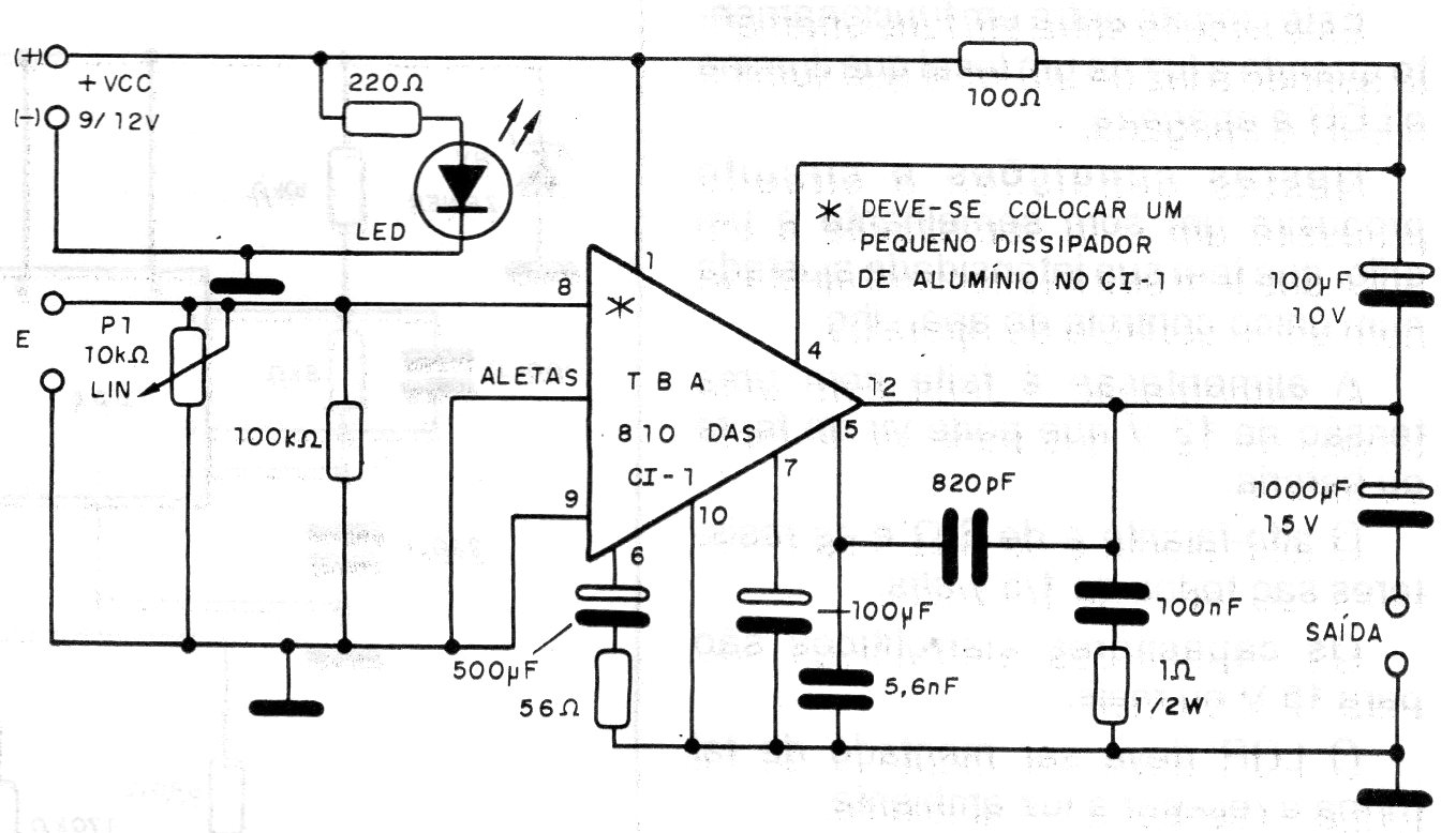 El circuito integrado TBA810 ya no es común en nuestros días. Este circuito muestra una aplicación de este componente en la modulación de transmisores AM hasta unos 5 W de potencia. El proyecto es de 1992 y el TGB810 debe ser dotado de disipador de calor. La alimentación se puede realizar con tensiones de 9 a 12 V.