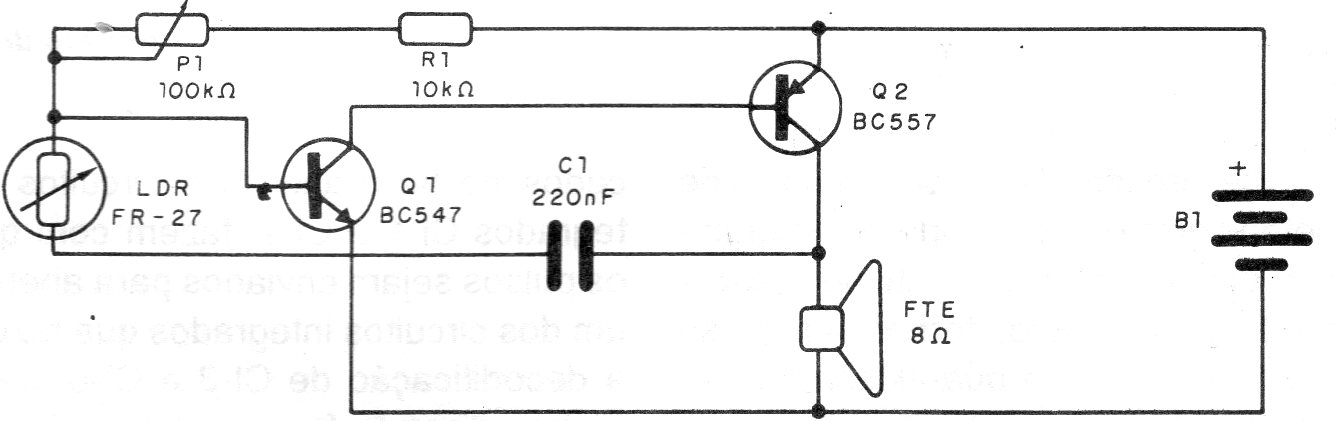 Esta es otra de las versiones de oscilador controlado por la luz que se pueden encontrar en este sitio. Este circuito tiene la frecuencia cambiada por la luz que incide en el sensor. La frecuencia central es dada por el condensador y la alimentación puede ser hecha con tensiones de 3 a 6 V.