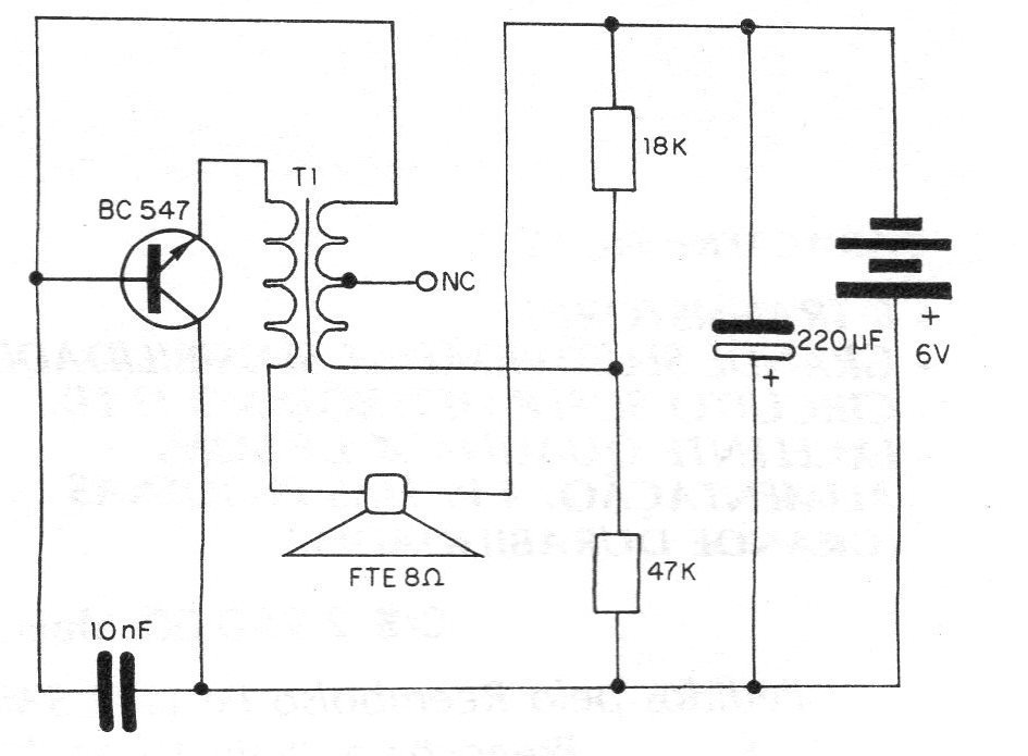 Este oscilador de audio muy simple se puede utilizar como dispositivo de llamada para intercomunicadores o, además, como alerta sonora. Encontramos este circuito en una documentación de 1982. El autor sugiere su utilización en conjunto con un intercomunicador, para llamar a personas en un lugar distante. Los componentes utilizados en este montaje no son críticos y se ha utilizado en el prototipo un transistor AC127. Como este transistor no es actualmente muy fácil de obtener, recomendamos su sustitución por equivalentes de silicio, ya que el Circuito no es crítico, como el BC547 o el BC237. Observamos que el funcionamiento del oscilador en cuestión depende mucho de las características del transformador usado, que debe tener un devanado primario de 200 a 2000 ohms y secundario der 8 ohms.