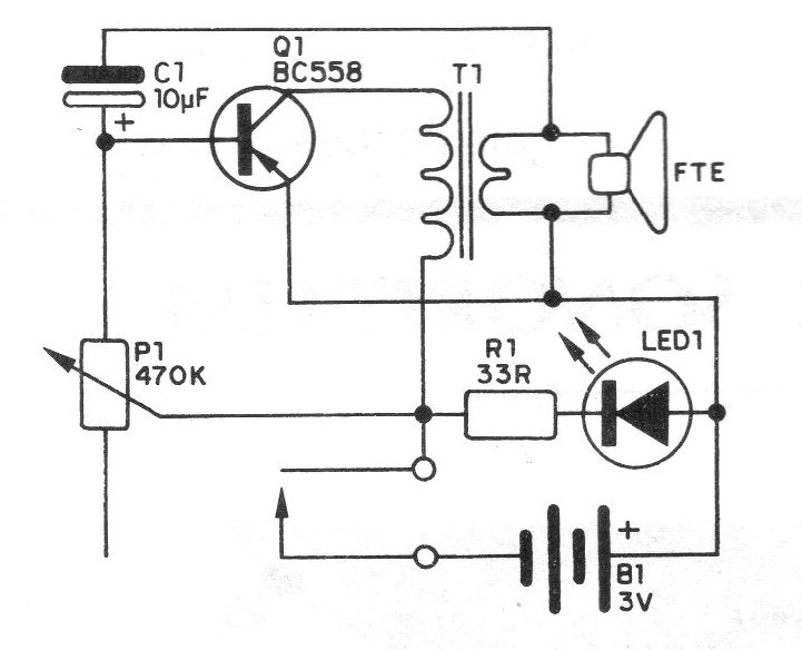 Este oscilador para la práctica de la telegrafía proporciona un buen sonido en un altavoz, con sólo un transistor y aún utiliza un LED para indicación visual. El circuito completo se muestra en la figura. Se trata de un oscilador de bloqueo, cuyo funcionamiento es el siguiente: al cerrar el manipulador, Q1 conduce. Con el aumento de la corriente en el primario del transformador, surge una tensión en el secundario, la cual carga C1 (negativamente en relación al transformador y positivamente en relación a la base de Q1), resultando en una polarización inversa en la base del transistor. Esta polarización inversa hace que me deje de conducir. Después de que C1 se descarga a través de P1, el transistor Q1 vuelve a conducir, repitiendo el ciclo. La velocidad de ocurrencia del ciclo es dada por P1 y C1, que determina entonces la frecuencia del sonido producido. Los componentes son todos comunes. El transformador T1 es del tipo utilizado en la salida de válvulas. Para Q1 se pueden utilizar transistores de uso general PNP o NPN, con la inversión de la polaridad de la fuente de alimentación. En el montaje se debe observar la polaridad del capacitor electrolítico, la posición del transistor, la polaridad del LED y la fuente de alimentación, que está formada por 2 pilas comunes.