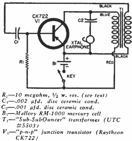 El CK722 es el primer transistor comercial del mundo, lanzado en la década de 50 por Raytheon. El circuito mostrado produce un tono de audio en un auricular. El transformador puede ser una unidad de radio transistorizada antigua. La alimentación también puede ser hecha por célula solar.