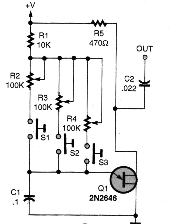 Conforme a la llave presionada, este oscilador produce un tono diferente, ajustado en el trimpot correspondiente. El circuito debe conectarse a una etapa de amplificación y su alimentación puede realizarse con tensiones de 6 a 9 V. Encontramos este circuito en una publicación de los años 90.