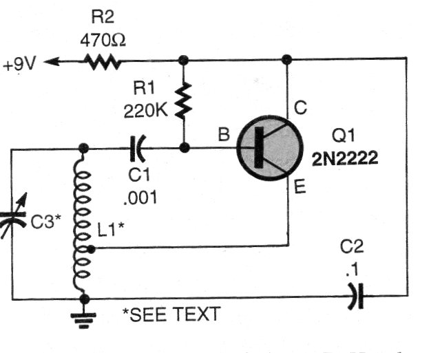 Esta es la configuración tradicional de un oscilador Hartley para altas frecuencias. Para 1 MHz enrole 80 espiras de hilo 26 o 28 en una forma de 1 cm con toma en la 30ª espira. Los condensadores deben ser cerámicos y el transistor admite el equivalente.