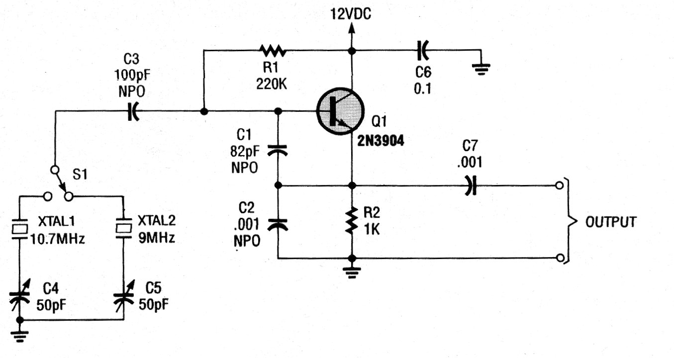 Este oscilador está indicado para el ajuste de FI de radios FM, teniendo su frecuencia controlada por cristal. La segunda frecuencia, que también depende del cristal puede ser usada con otros propósitos. El circuito es de una antigua documentación americana que puede utilizar el BC548 o BF494 en lugar del transistor original.