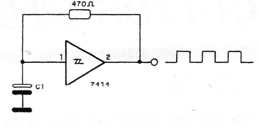 Dependiendo del valor de C1, este oscilador puede producir señales de hasta 1 MHz. Para un capacitor de 10 nF, tendremos algo alrededor de 100 kHz y para 100 uF tendremos una frecuencia de aproximadamente 10 Hz, eso manteniendo el resistor de carga y descarga en 4709. La alimentación del 7414 debe realizarse con 5 V entre los pines 14 (+) y 7 (-). La señal obtenida en la salida es rectangular con un ciclo activo del 50%.(7414)