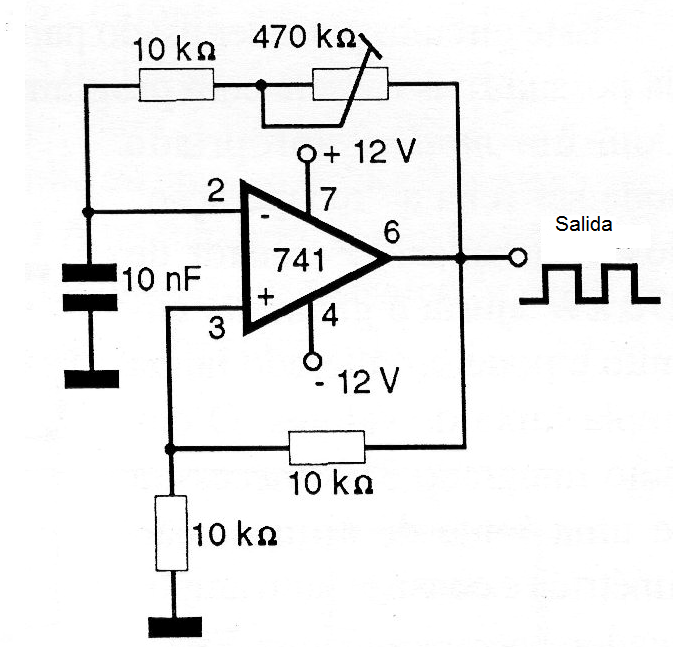 Esta configuración se puede encontrar en varios otros artículos del sitio del autor. Se produce una señal rectangular de frecuencia en el rango de 200 a 4 kHz, ajustado por el potenciómetro. La fuente de alimentación debe ser simétrica y los amplificadores operativos equivalentes se pueden emplear. La banda de frecuencias, dentro de los límites aceptados por el operario podrá ser alterada con el cambio del condensador. El cálculo de este tipo de circuito se puede encontrar en la sección de matemáticas para electrónica.