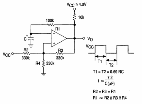 Otros comparadores de la serie como el LM239 y LM339 se pueden utilizar en este circuito oscilador. Los valores de los componentes para la frecuencia deseada se suministran junto al diagrama.