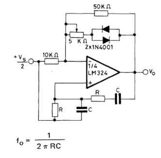 Esta configuración, que se puede encontrar en otros manuales de fabricantes del LM324, es del manual de la SGS de 1982. La frecuencia puede ser calculada por la fórmula dada junto al diagrama y la fuente de alimentación debe ser simétrica.