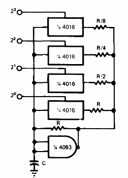 Los resistores R determinan las frecuencias del oscilador junto con C. El circuito es de una documentación de 1976. La tensión de alimentación puede variar entre 5 y 15 V y la frecuencia máxima es del orden de algunos megahertz, dependiendo de la tensión.