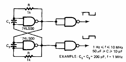 La frecuencia de este oscilador depende de los capacitores, pudiendo quedar entre 1 Hz y 10 MHz. La alimentación debe ser hecha con tensión de 5 V y las salidas son de señales rectangulares. El circuito es de una documentación técnica de 1978.