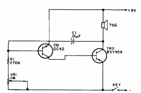 Encontrado en una publicación para radioaficionados de 1975, este simple oscilador se destina a la práctica de código Morse. El transistor PNP puede ser el BC558 y el NPN el BC548. La alimentación se puede realizar con tensiones de 6 a 9 V. El tono se ajusta en el potenciómetro.