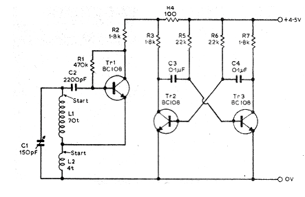 Este diagrama forma parte de un artículo de una revista inglesa de junio de 1975. Este circuito puede ser utilizado como un transmisor telegráfico experimental de corto alcance. Consulte en CIR855 detalles de la bobina y de los componentes. La alimentación se puede hacer con tensiones de 4,5 a 9 V. El alcance será de unos metros, utilizando un radón común de ondas medias.