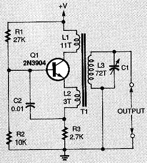 Este es un oscilador poco común que utiliza dos bobinas en el circuito de realimentación. El número de espiras para 1 MHz se da en el diagrama en términos de vueltas (T). Este circuito salió en una publicación americana de enero de 1996. El circuito puede generar señales de frecuencias hasta 30 o 40 MHz. El transistor tiene como equivalente el BC548 o 2N2222 .. Para calcular la frecuencia use las fórmulas de la sección de Matemáticas Para (Circuito LC). El circuito debe funcionar con tensiones de 6 a 12 V. La realimentación es hecha por C2 y L3 sirve de carga como secundario de un transformador, alimentando la salida.
