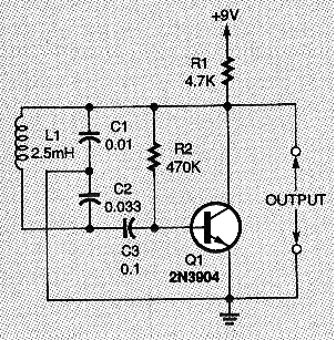 Este circuito salió en una Electronics Now, publicación americana de enero de 1996. El circuito puede generar señales de frecuencias hasta 30 o 40 MHz. El transistor tiene como equivalente el BC548 o 2N2222. Para calcular la frecuencia, utilice las fórmulas de la sección de Matemáticas para Electrónica (Oscilador de Colpitts). Para 1 MHz enrole 100 espiras de hilo 28 AWG en un bastón de ferrita. El circuito debe funcionar con tensiones de 6 a 12 V.