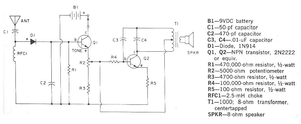 El oscilador de tono lateral o side tone oscillator es un circuito que genera un tono con la señal transmitida por un transmisor telegráfico, posibilitando así el monitoreo de su funcionamiento. El circuito mostrado salió en una publicación americana 101 Electronic Projects de 1979 y con algunos cambios puede ser montado aún hoy. Los transistores, por ejemplo, pueden ser los BC548 o el propio 2N2222 que aún es común y el transformador de salida aprovechado de una vieja radio transistorizada. La antena es del tipo telescópico colocado cerca del transmisor. La lista de material en el original en inglés va a seguir junto con el diagrama. Se observa que el circuito tendrá más sensibilidad con el uso del 1N34 en lugar del 1N914.