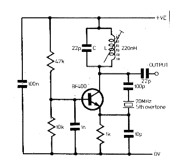 Este oscilador fue sugerido en una edición de mayo de 1987 por una revista inglesa. El circuito opera con un cristal para el quinto sobretom de 70 MHz. El circuito de salida LC debe ser sintonizado en la frecuencia del cristal. Las frecuencias cercanas pueden ser generadas con la utilización de cristales apropiados. Los condensadores deben ser cerámicos y el circuito debe ser alimentado con tensiones de 6 a 12 V. Otros transistores de RF como los BF494 y BF495 pueden ser probados en este circuito.