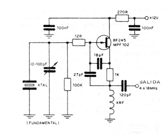 Los transistores de efecto de campo poseen características que permiten la realización de excelentes osciladores, como el que mostramos en la figura, que opera de 4 a. 18 MHz. El transistor usado es un FET de unión, como el BF245 o MPF102, y no hay circuito tanque sintonizado. El choque RF debe tener una impedancia suficientemente alta en la frecuencia de resonancia del cristal, para permitir el pasaje de la señal hacia la salida. El cristal es del tipo fundamental y la serial de salida variará de intensidad conforme a la frecuencia. El consumo de corriente de este circuito es bastante bajo, inferior a 10 mA, y si se notara poco rendimiento, se puede sospechar la inversión de los terminales D y S que en los transistores de este tipo son intercambiables.