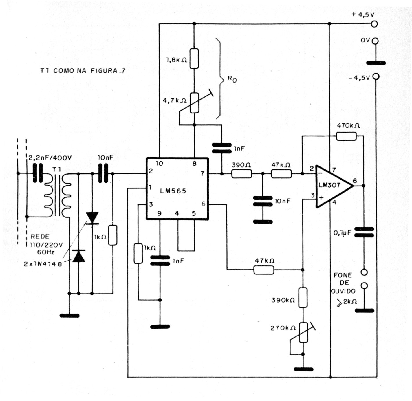 Este es el receptor para escucha telefónica a través de la red mostrada en CIR5938S. El circuito también utiliza componentes poco comunes actualmente, pero puede ser adaptado para operar con componentes modernos. La frecuencia de recepción es de 100 kHz.