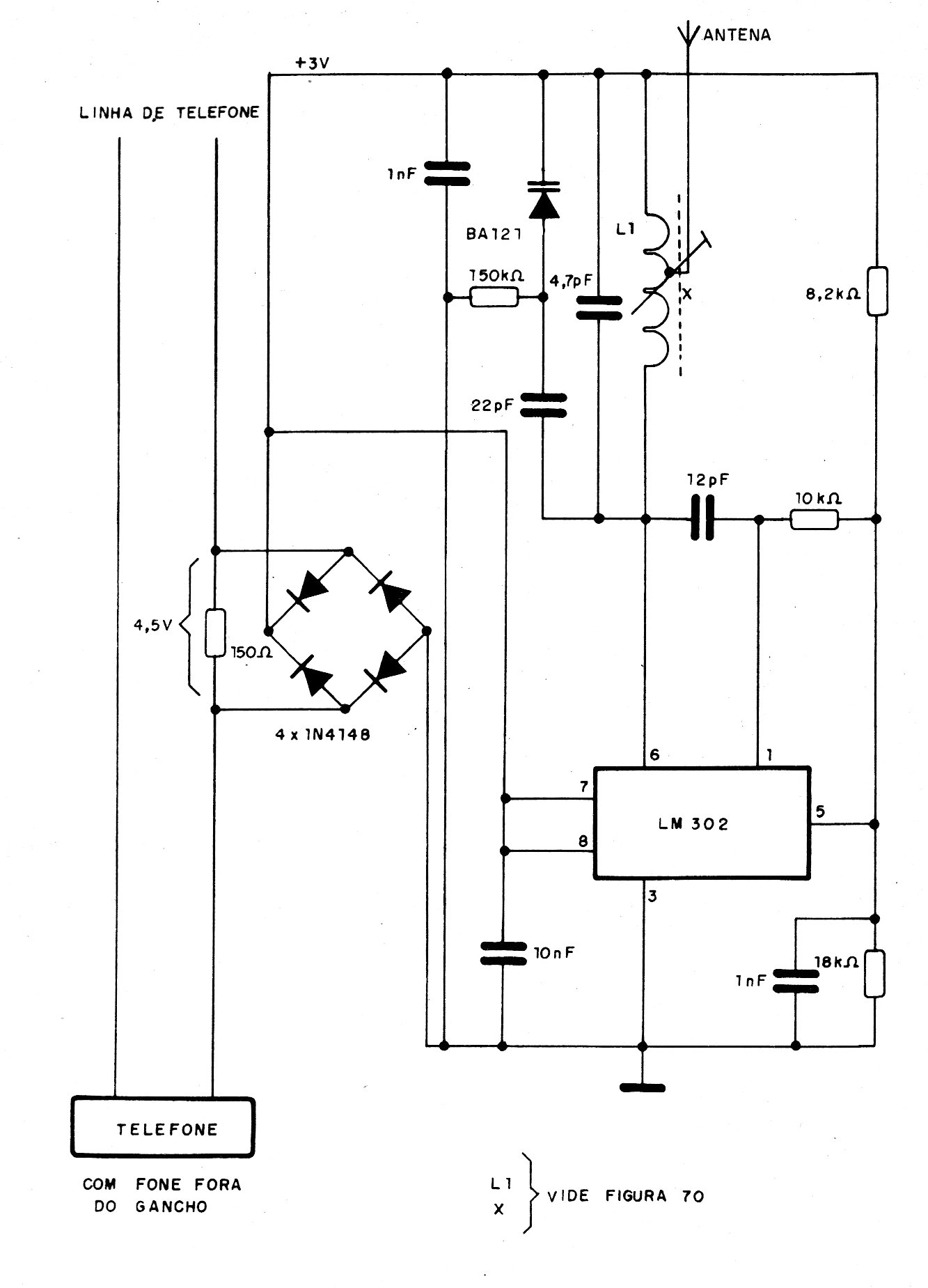 El circuito integrado utilizado en este circuito de los años 90 no es muy común actualmente. Se puede utilizar un paso transmisor equivalente con transistores, como se muestra en otros circuitos de este sitio. El circuito tiene como bobina 3 + 2 espiras de hilo 30 o 32 en un núcleo de 0,5 cm para L1. L2 consiste en 2 espiras sobre L1.