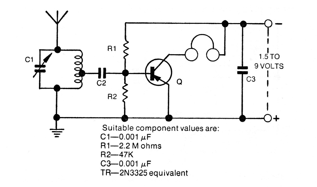 Cualquier transistor PNP de uso general de germanio o silicio se puede utilizar en este receptor. El auricular debe ser de alta impedancia con al menos 2 k y la alimentación se puede hacer con tensiones de 1 a 9 V. La bobina tiene 20 + 70 espiras de hilo 28 o 30 en un bastón de ferrita. La antena debe ser larga.