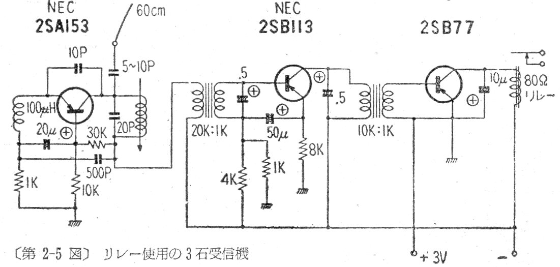 Este circuito de tres transistores puede controlar relés o servos de 3 V a partir de transmisores modulados de 17 MHz. El circuito fue encontrado en una documentación japonesa de 1961 y funciona con el circuito CIR11803 además de otros. No se dieron datos de la bobina receptora.