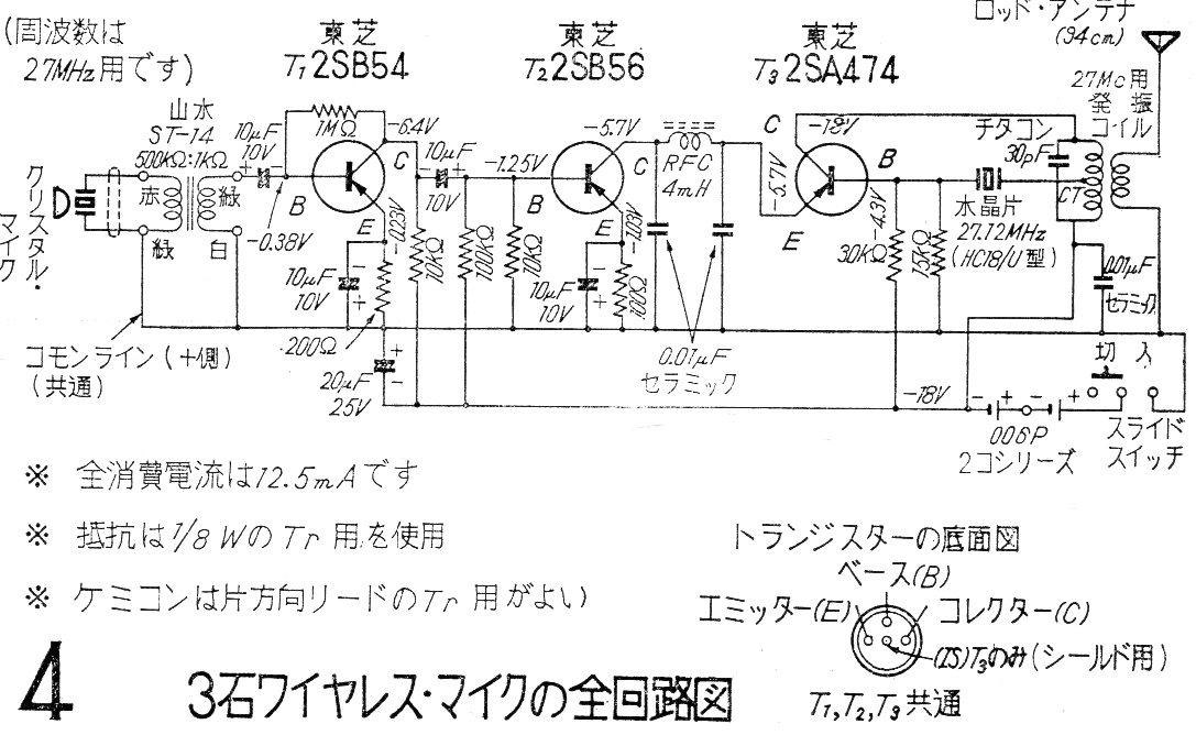 Encontramos este transmisor portátil que alcanza hasta 200 metros en una publicación japonesa de los años 60. El circuito es alimentado por una tensión de 18 V obtenida de baterías y utiliza un micrófono de cristal. La antena es telescópica. Los detalles de las bobinas no se suministran pero se pueden elaborar en base a proyectos similares de este sitio.