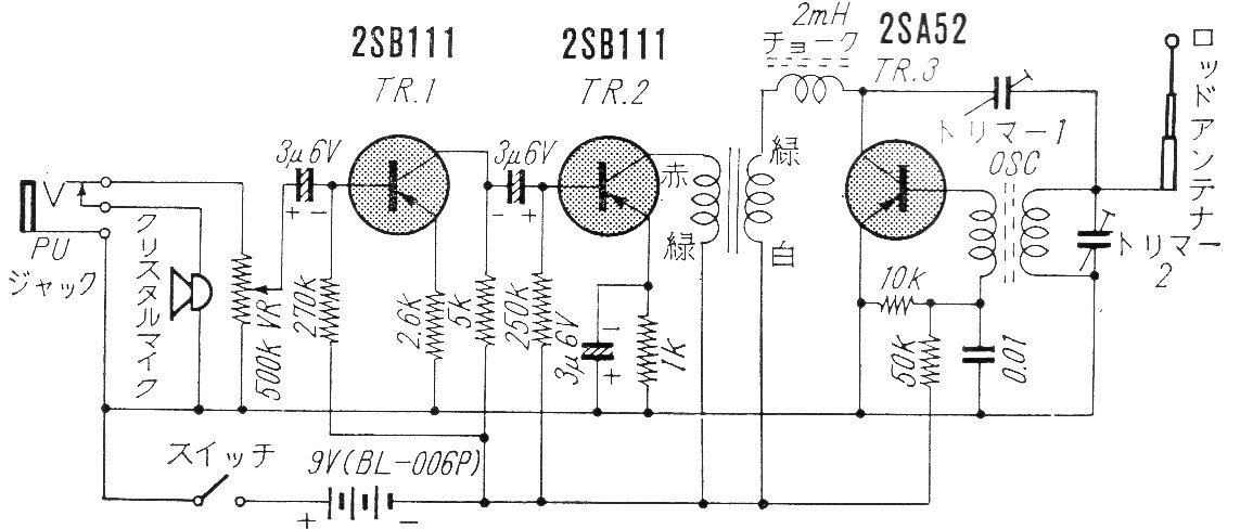 Este circuito, con algunos metros de alcance, puede funcionar como un micrófono inalámbrico o transmisor para medios con reproducción en una radio. El circuito es de una antigua publicación japonesa, usando transistores comunes en la época (1968). La alimentación se realiza con 9 V y no se dan detalles de las bobinas.