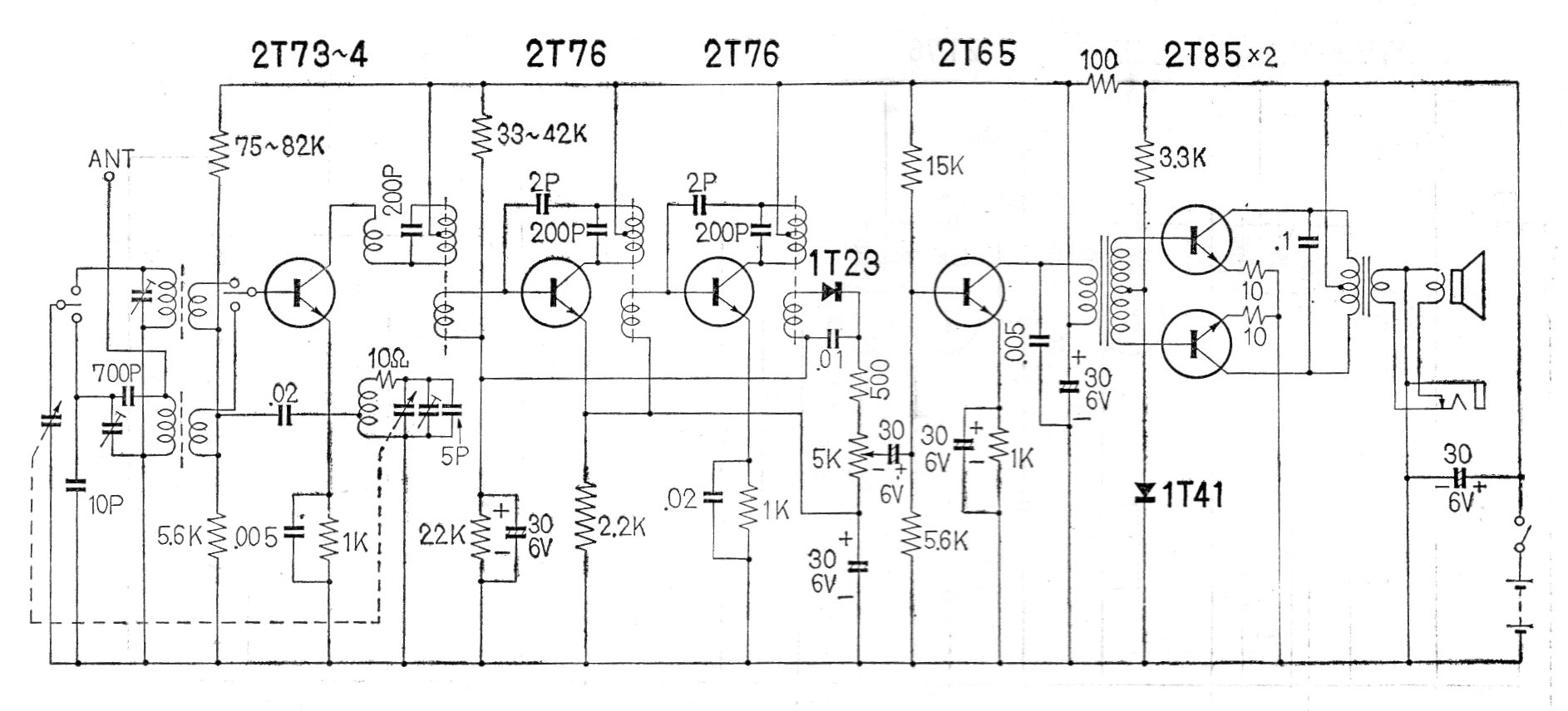 Esta radio comercial de ondas medias y cortas fue fabricada en Japón en los años 60. El circuito tiene 6 transistores y recibe más ocupada del rango de ondas medias las frecuencias de 2,5 a 4,5 MHz. El circuito es alimentado por 4 pilas y utiliza transistores de germanio de la época.