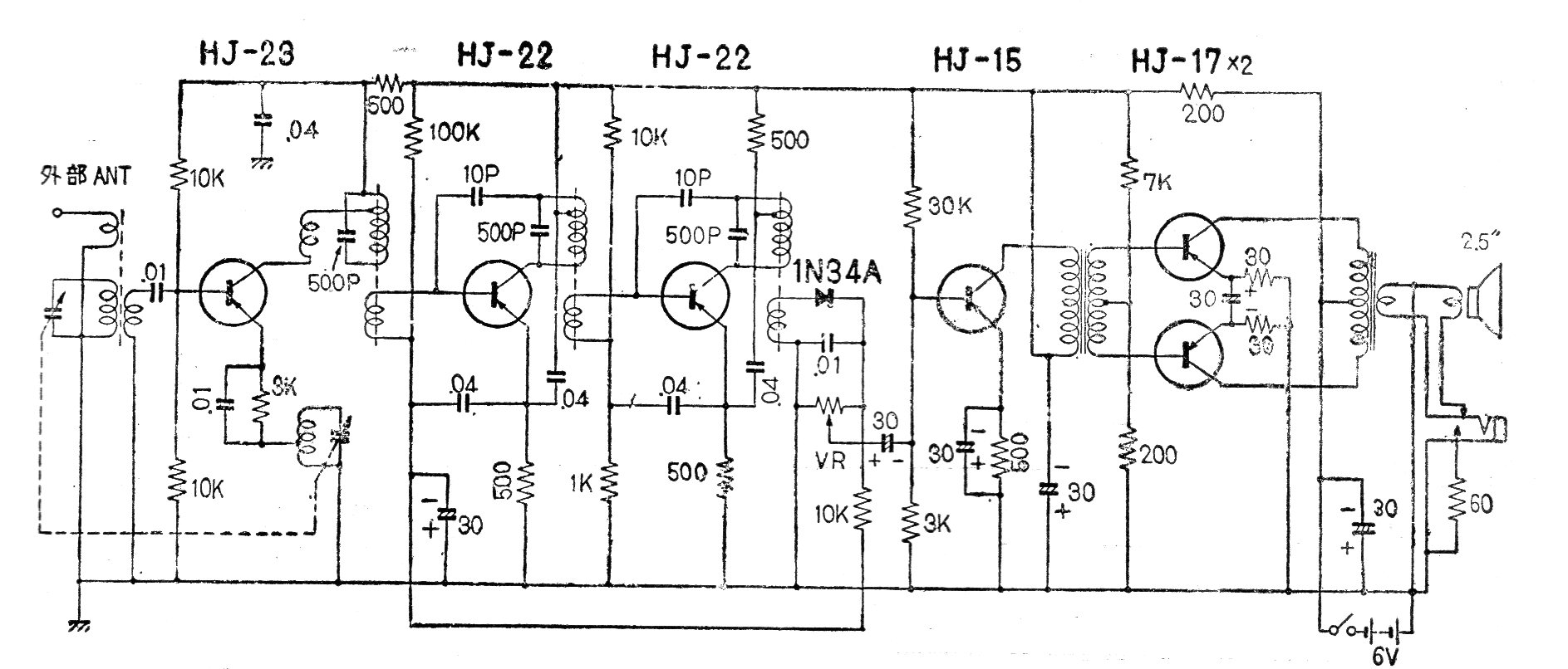 Este pequeño radio de ondas medias fue fabricado en los años 60 en Japón. El circuito es alimentado por 4 pilas y tiene una potencia de salida de 60 mW a 100 mW. El receptor es del tipo super-heterodino con buena selectividad y sensibilidad.