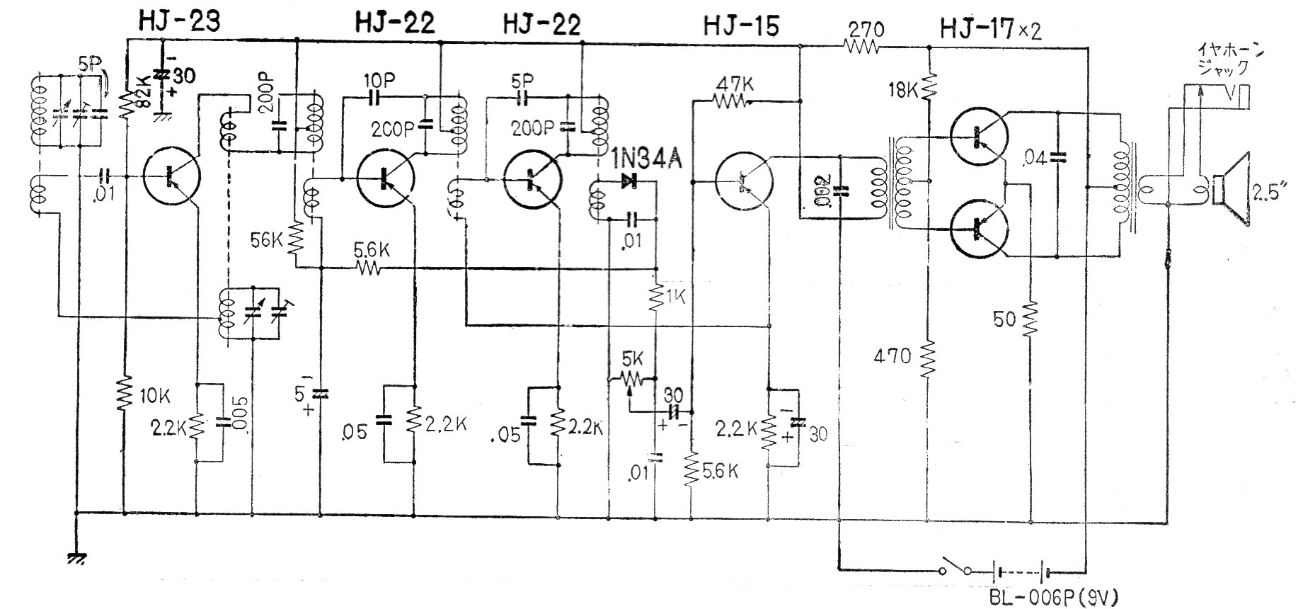 Encontramos el diagrama de esta radio comercial japonesa en una documentación de los años 60. El receptor tiene 60 mW de potencia de salida y es alimentado por una tensión de 9 V. El circuito es super-heterodino con salida en push-pull.