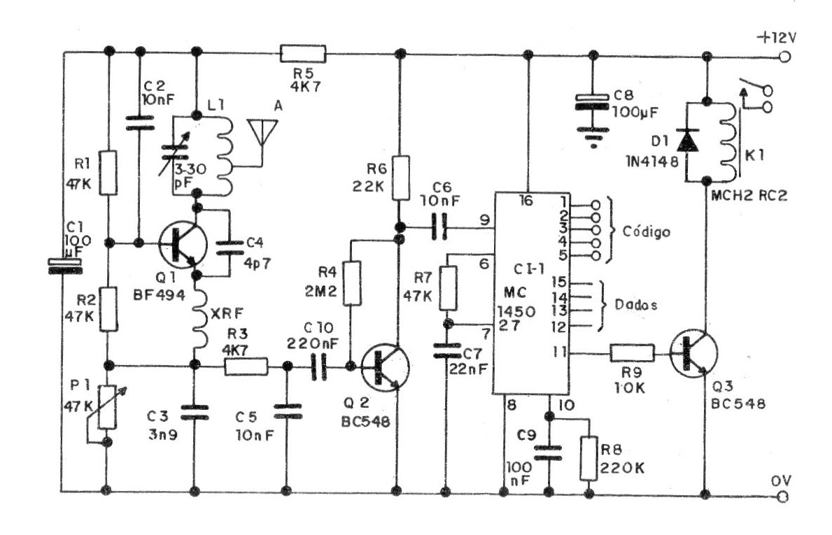 Este es el receptor para el transmisor del circuito anterior. El componente principal MC145027 no es muy común actualmente. En él se inserta por puentes el código de recepción para que sólo reconozca la señal del transmisor correspondiente. La bobina del receptor debe ser igual a la del transmisor.