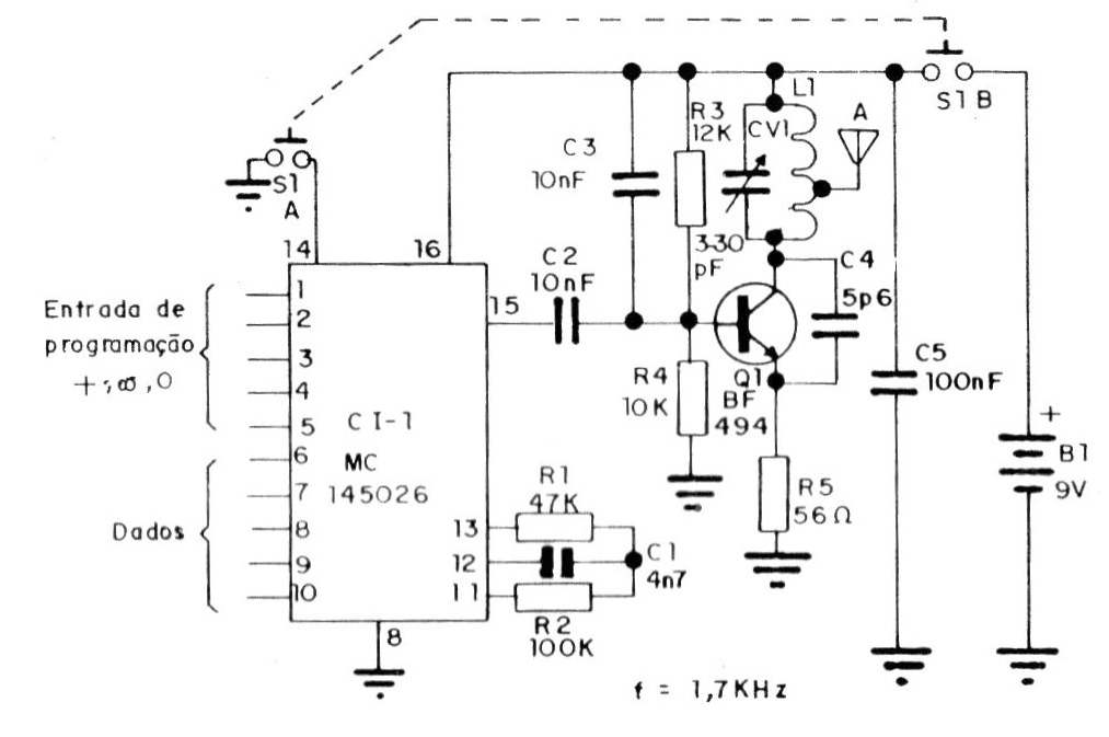 El circuito integrado utilizado en este codificador es de tipo no común actualmente, pero se encuentra en muchos controles remotos de portones antiguos. En la figura tenemos el transmisor que tiene el código programado por puentes. La bobina del transmisor depende del rango de frecuencias de funcionamiento.