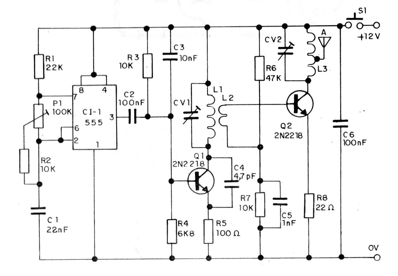 Este potente transmisor modulado en tono para control remoto utiliza un oscilador con el 555. Las bobinas dependen de la frecuencia de operación que tanto pueden quedar en la banda del 27 MHz como de VHF o incluso FM. El alcance puede superar los 500 metros.