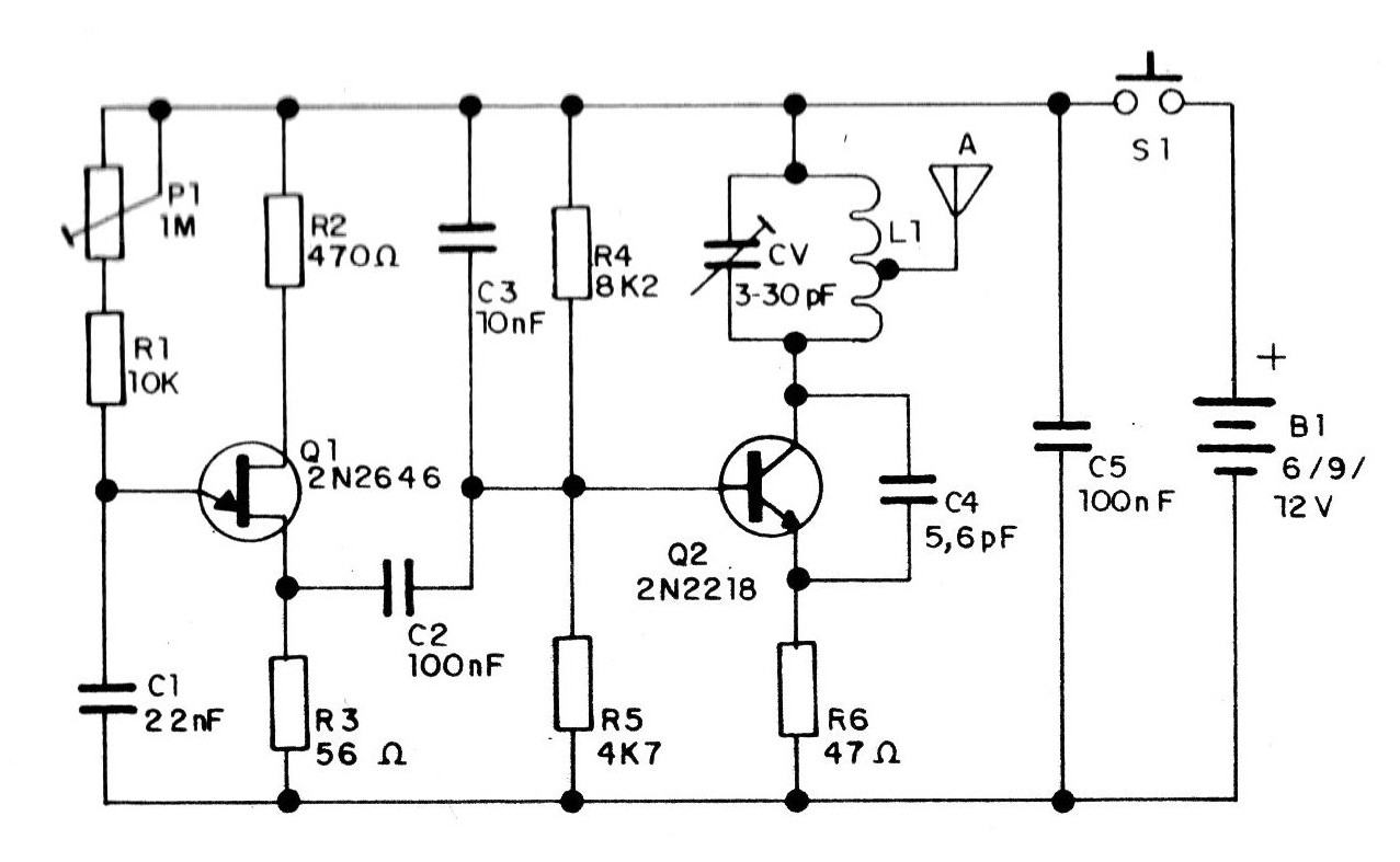 Este transmisor potente es modulado en tono que sirve para sistemas que utilizan los circuitos anteriores en la recepción. El circuito puede llegar a varios cientos de metros y para el rango de VHF en torno a 10 MHz la bobina tiene 3 + 3 espiras de hilo 18 a 22 en forma de 1 cm sin núcleo. La alimentación se realiza con tensiones de 6 a 12 V.