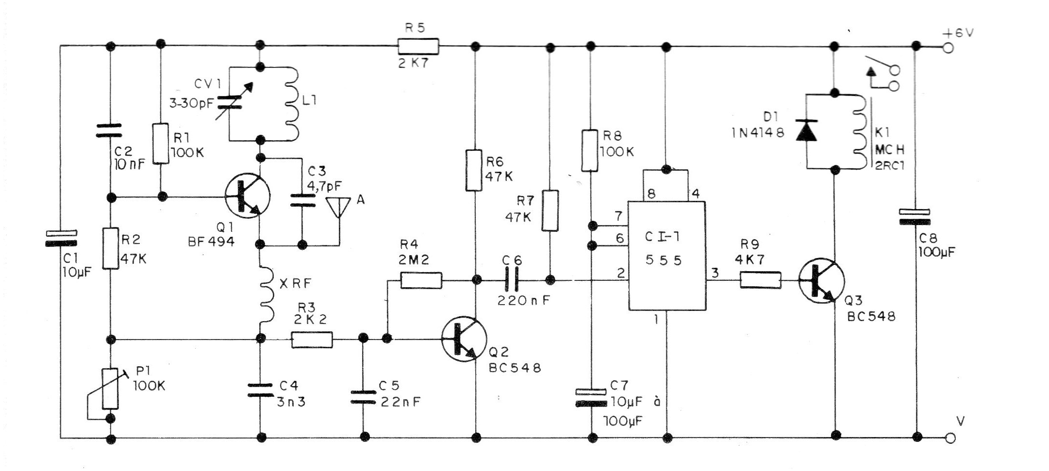 Con un toque en el transmisor (que puede ser el del CIR1345716S) el relé de este receptor acciona y permanece accionado por un intervalo de tiempo que depende de R5 y C2. La bobina L1 tiene 4 o 5 espiras de acuerdo con el transmisor usado. El relé es del tipo sensible para 6 V.
