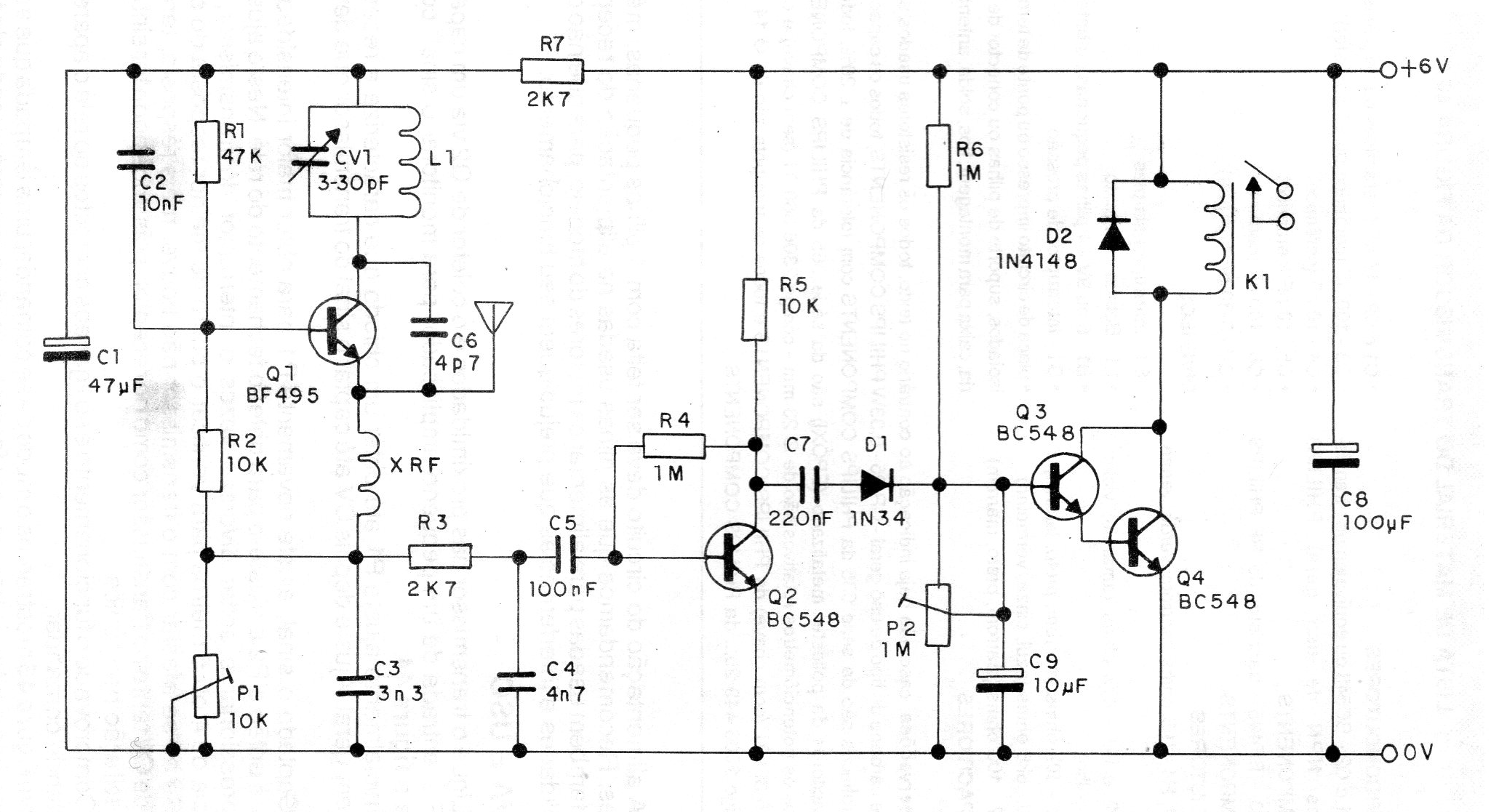 Este es el circuito receptor para el transmisor anterior (CIR13469). El alcance del sistema puede llegar a 100 metros con condiciones favorables. L1 tiene de 5 a 6 espiras de hilo 22 o 24 en forma de 1 cm sin núcleo. La antena debe tener de 50 cm a 1 metro. El relé es del tipo sensible y los condensadores alrededor de BF495 deben ser cerámicos.