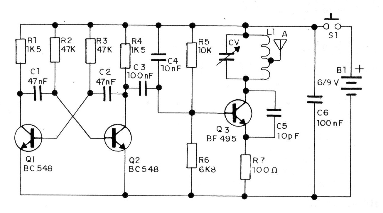 Este transmisor simple modulado en tono puede operar entre 27 y 100 MHz dependiendo de la bobina. Para el rango de FM enrolle 3 + 3 espiras de hilo 18 a 22 con un diámetro de 1 cm sin núcleo. La antena puede ser de tipo telescópico de 15 a 50 cm de longitud. La alimentación se puede realizar con pilas o baterías.