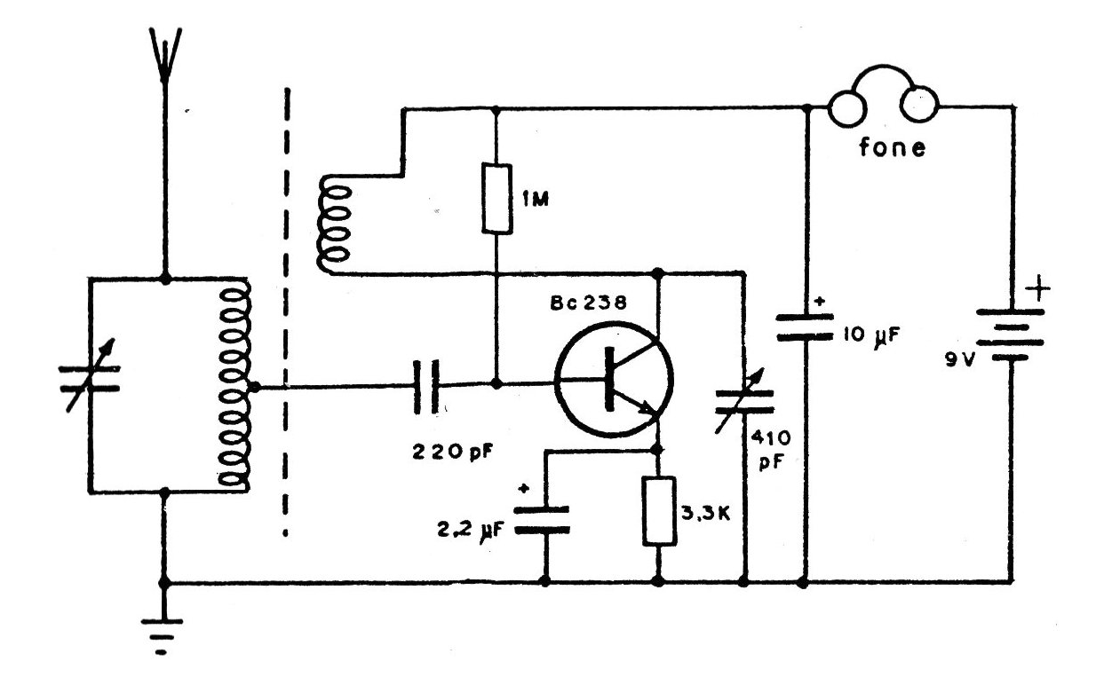 Para la banda de ondas medias la bobina de antena tiene 30 + 50 espiras de hilo 28 en un bastón de ferrita y la bobina de realimentación de 5 a 10 espiras del mismo hilo sobre la bobina de antena. El auricular es de alta impedancia magnética y cualquier transistor de uso general puede ser usado.