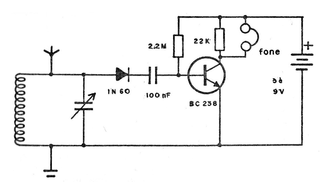 Dependiendo de la bobina este simple receptor puede captar estaciones de la banda de ondas medias o cortas. Para ondas medias enrolla 80 a 100 espiras en un bastón de ferrita. Para ondas cortas de 20 a 40 espiras. El transistor puede ser el BC548 y el auricular debe ser de cristal. Utilice una antena muy larga.