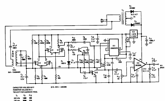 El circuito presentado es el receptor para el CIR5645S, también sugerido por National Semiconductor. La bobina es igual a la del transmisor y el amplificador de audio puede ser equivalente más moderno o externo. La matriz de transistores puede ser sustituida por equivalentes discretos.