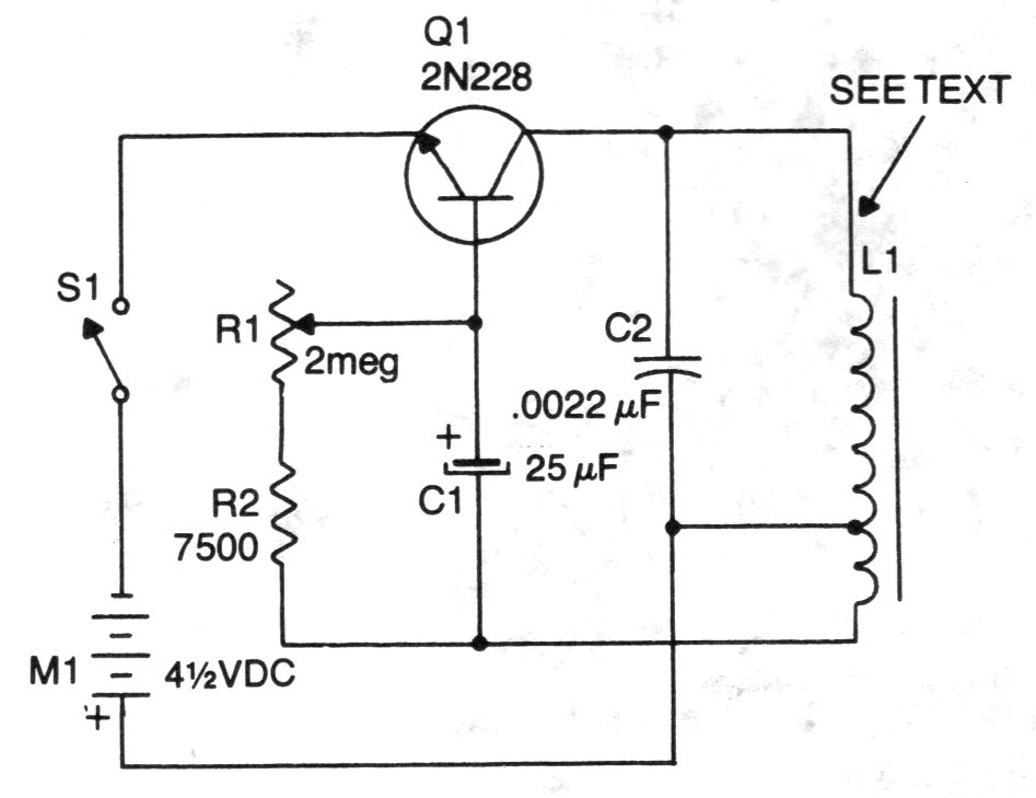 Los pulsos de intervalos emitidos por este circuito se captan en una radio de ondas medias cercanas. El circuito es de una publicación de 1981, pero puede ser montado con un BC548. La bobina consta de 30 + 70 espiras de hilo 28 en un bastón de ferrita. Se puede conectar una antena al colector del transistor para mayor alcance. La alimentación se puede realizar con tensiones de 4,5 a 6 V.