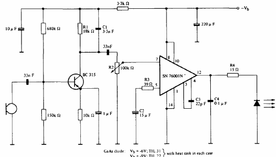 El circuito transmisor para un intercomunicador por infrarrojo es de Texas Instruments. El operacional admite el equivalente y el transistor puede ser el BC558. Observe la polaridad de la alimentación. El circuito utiliza el micrófono de cerámica, pero puede ser adaptado para usar el electreto.