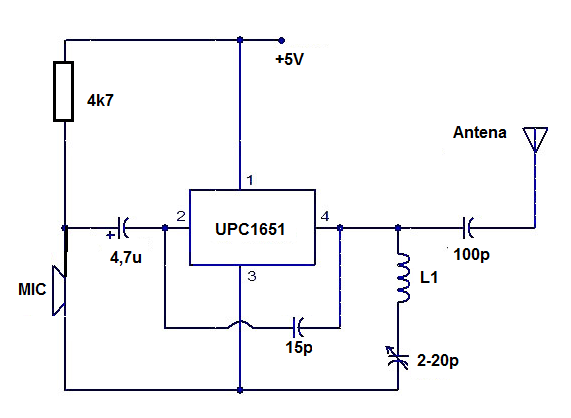 Este transmisor de FM utiliza un circuito integrado, no muy fácil de obtener UPC16451. El alcance es de unos metros con una antena de 15 a 40 cm. La bobina está formada por 4 espiras de hilo 28 o 26 en forma de 1 cm sin núcleo. El trimmer no es crítico y el micrófono es de electreto. El capacitor de 15 pF debe ser cerámico.